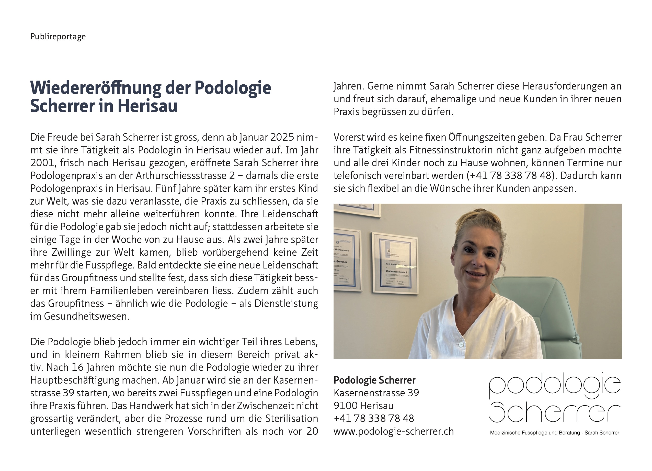 Wiedereröffnung Podologie Scherrer, Kasernenstrasse 39, Herisau